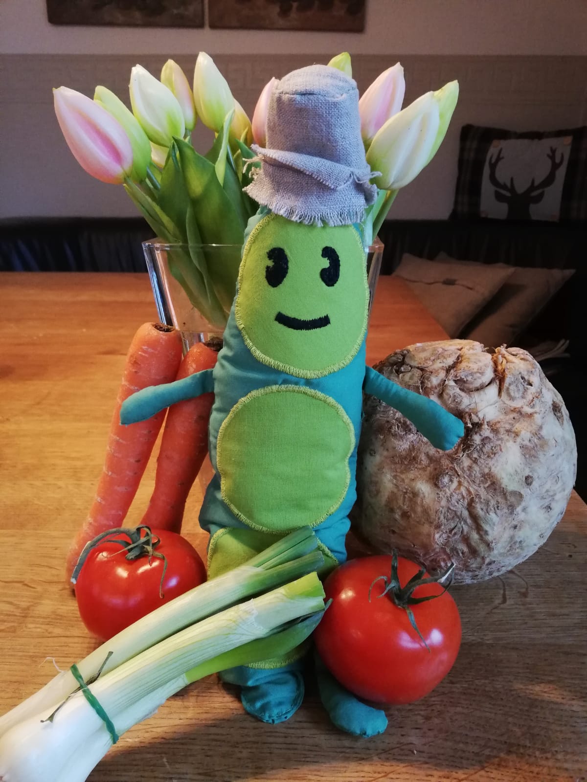Neben den jeweiligen Azubis des zweiten Lehrjahrs haben wir noch ein ganz besonderes Teammitglied: unser Maskottchen Eddy Erbse.